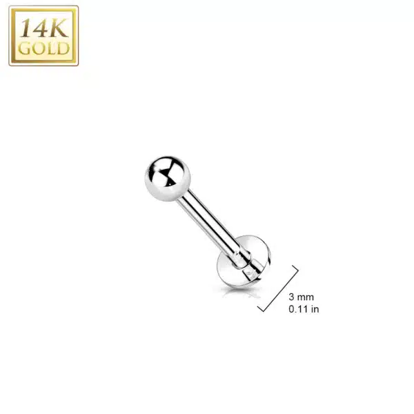 Deze elegante threadless push-in labret is gemaakt van massief 14K goud en afgewerkt met een subtiel balletje aan de voorkant. Dankzij het flat back design zit hij extra comfortabel, ideaal voor je oorpiercings, Monroe of andere piercings. Een tijdloze en luxueuze keuze!