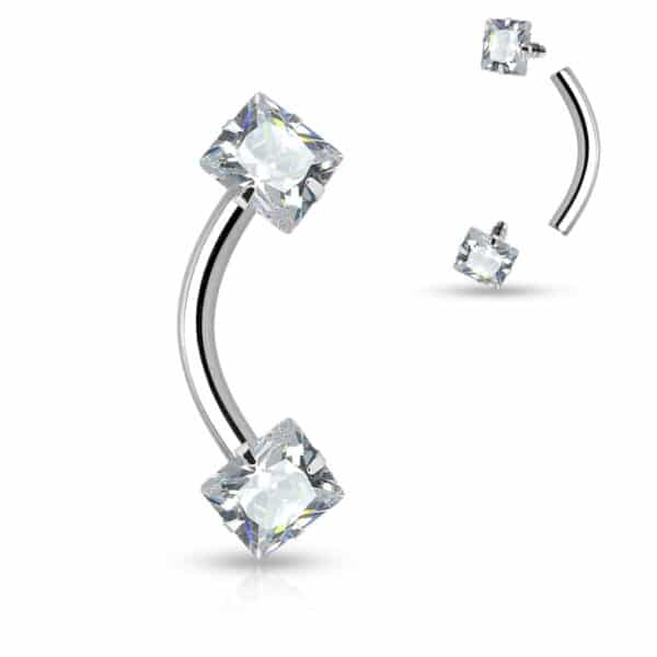 Deze gebogen barbell van 316L chirurgisch staal is intern geschroefd en afgewerkt met fonkelende vierkante cz steentjes in een stevige prong-setting. Perfect voor wenkbrauwpiercings of andere gebogen toepassingen. Comfortabel, stijlvol en elegant.