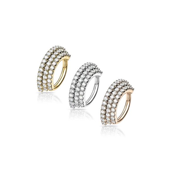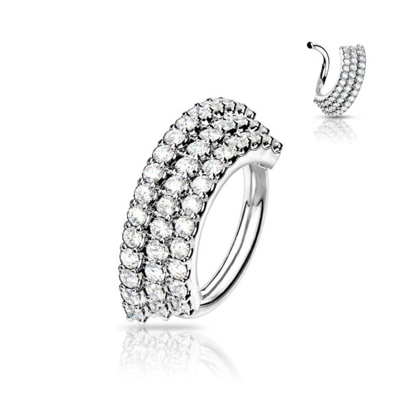 Deze elegante ring is voorzien van drie rijen schitterende CZ steentjes, die zorgen voor een mooie glinstering. De ring is perfect voor elke gelegenheid en kan gemakkelijk gecombineerd worden met andere sieraden.